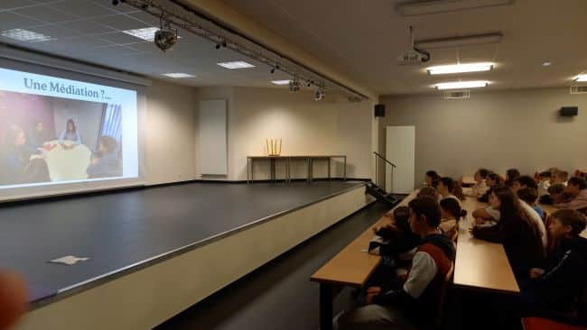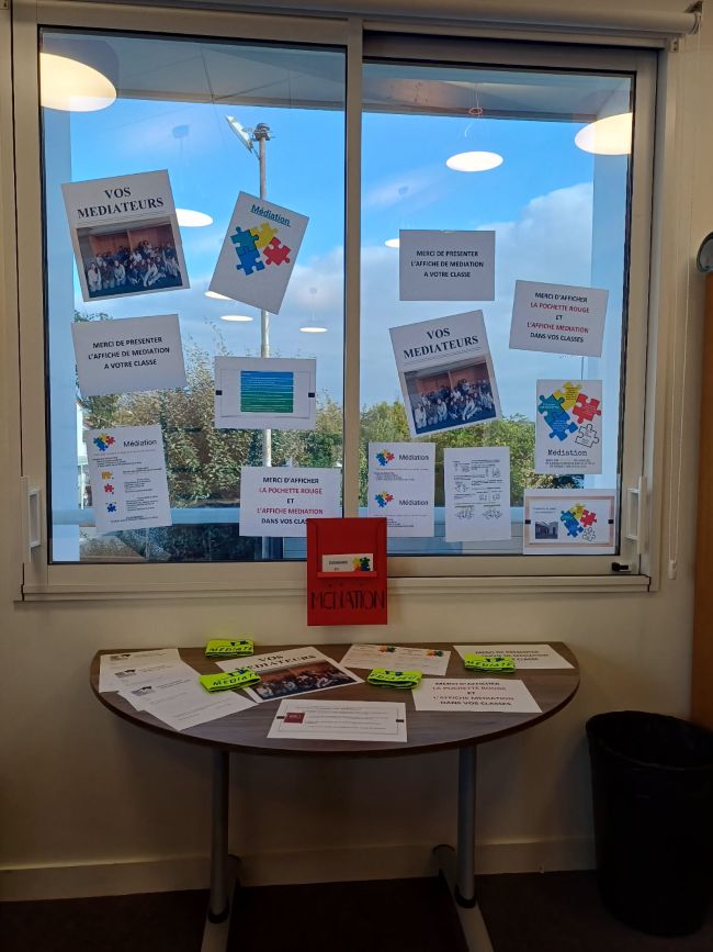 Une présentation de la formation pour devenir médiateur a été faite à tout le niveau 5ème. Les élèves souhaitant « postuler » sont repartis avec une lettre de motivation à remplir et à rapporter pour la rentrée à la vie scolaire. Un espace « Médiation » a également trouvé sa place en salle des personnels afin de permettre à tous de repenser à cette option quand arrive un petit conflit entre élèves.