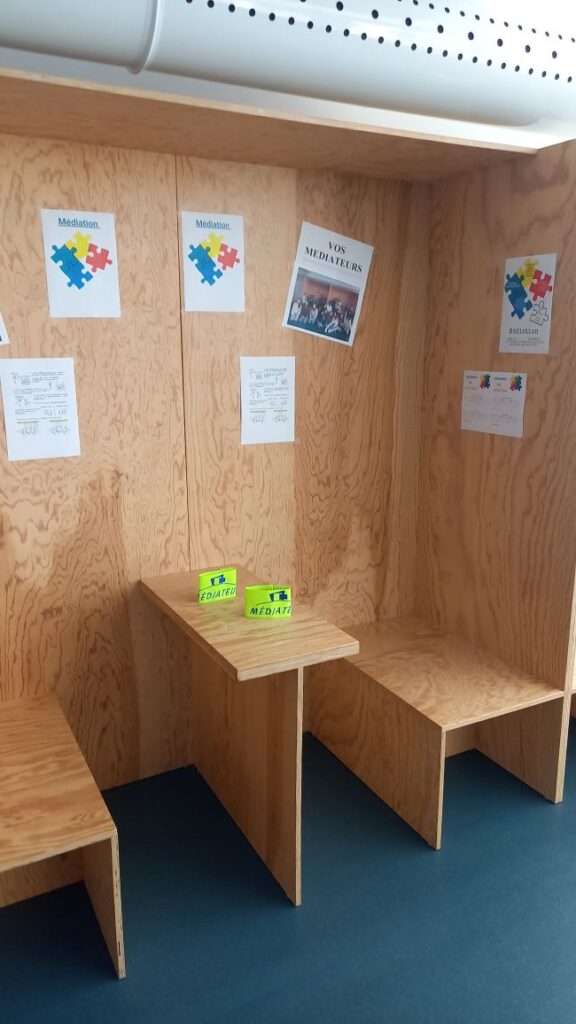 Ils sont ensuite passés dans les classes de 6ème pour se présenter et présenter la médiation par les pairs. Certains sont descendus sur la cour 6eme avec les brassards pour dialoguer avec les élèves sur le temps de la récréation le matin. D’autres étaient dans l’Archipel, à la récréation de 15h.