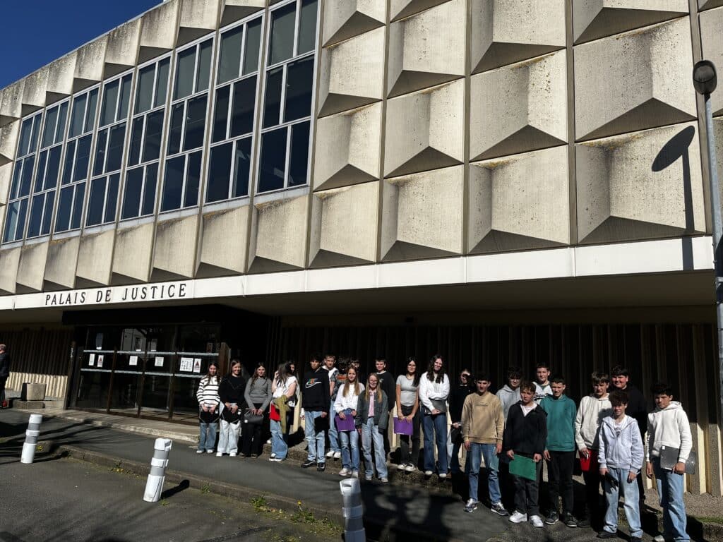 Comme toutes les classes de 4e cette année, c’est au tour des 4G de réaliser une sortie au Tribunal Judiciaire de La Roche sur Yon. Pendant environ 1h30, les élèves deviennent spectateurs de plusieurs procès, et découvrent les codes et les exigences du monde judiciaire. Ils ont pu observer les conditions d’exercice de la Justice et ses acteurs, l’occasion aussi d’enrichir leur Parcours Avenir (différents métiers observés) et Citoyen.Un moment très solennel sur place, mais qui les fait vivement réagir par la suite, lors du bilan en cours d’Histoire-Géographie et EMC.