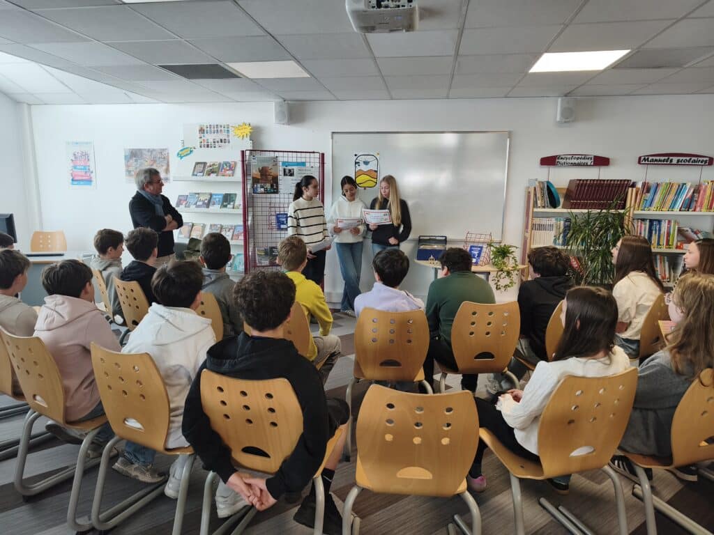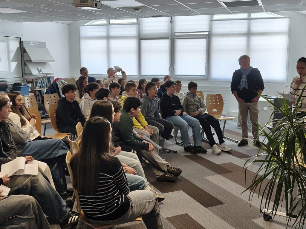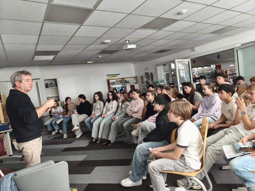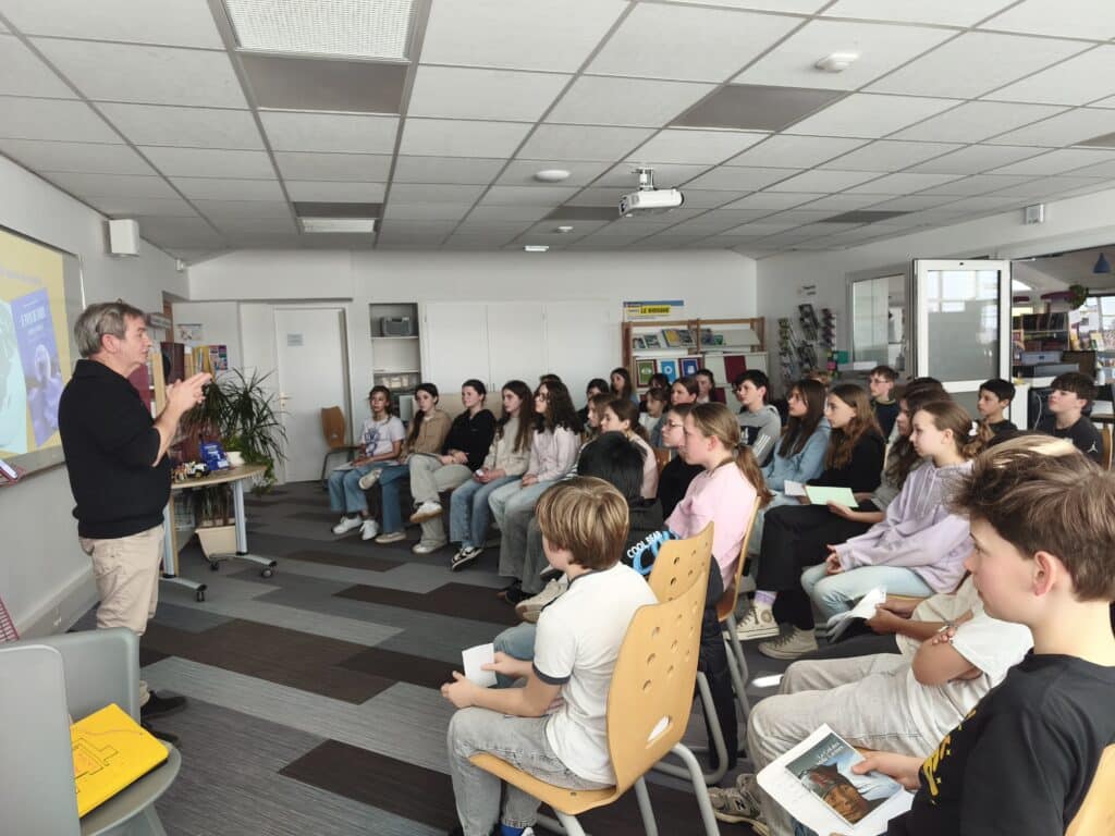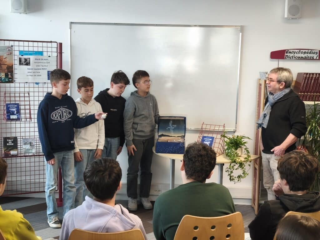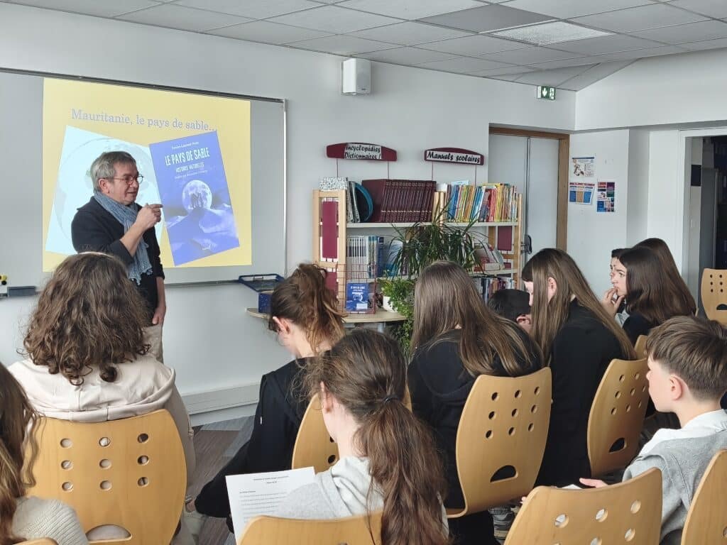 M. Petit est venu à la rencontre des élèves volontaires de 5è et 4è pour répondre à leurs questions sur son parcours, l’écriture, l’inspiration ou encore des conseils pour les écrivains en herbe. Cela a également été l’occasion de nous expliquer la genèse de son livre, prétexte à un merveilleux voyage dans le désert de Mauritanie, aux côtés de Yani et de son grand-père Hassen, le chamelier.