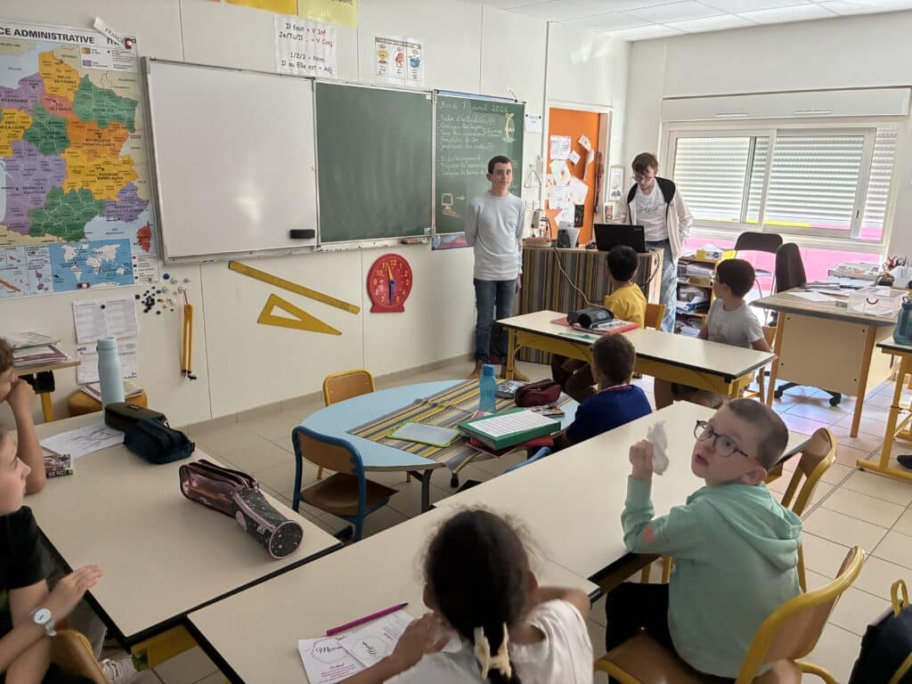 Ils leur ont donc évoqué les problématiques d’extinctions d’espèces animales, de pollution, de santé, de gaspillage d’eau… afin de mettre au défi les élèves de CM1 et CM2 en agissant au quotidien par des petites actions qui peuvent permettre de limiter voire améliorer la situation.